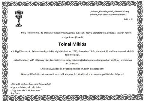 Mély fájdalommal, de Isten akaratában megnyugodva tudatjuk, hogy a szeretett férj, édesapa, testvér, rokon, szolgatárs és jó barát, Tolnai Miklós, a Szilágyfőkeresztúri Református Egyházközség lelkipásztora, 2025, december 25-én, életének 58. évében visszaadta lelkét Teremtőjének. Lezárult életéért való hálaadó gyászistentiszteletre a szilágyfőkeresztúri református templomban kerül sor, szombaton 14.00 órától.